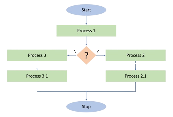Dicisional flowcharts are designed for the problem that requires two or more different solutions based on different conditions. Flowcharts of this kind start with a linear flow but there comes a condition at some point. NOw as per the condition, process flow gets divided into two or more process flows.
