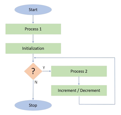 Iteration refers to the process flow where a certain set of processes keep on repeating till a condition is TRUE. Iterative flowcharts are designed for the problem that have this kind of process flow. A Liner flow starts but there comes an initialization step followed by a condition. Now based on the TRUE state of the condition, a set of processes continue including an Increment / Decrement statement. This flow comes back to the condition again as it all had to repeat till the condition remains TRUE. It's only when the condition goes FALSE that the flowchart comes to the end.
