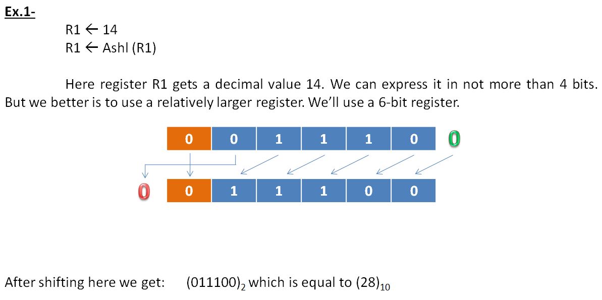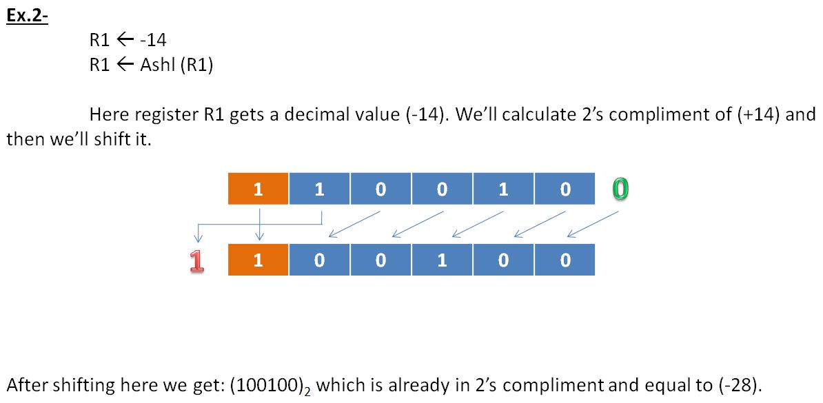 In this operation we shift signed binary numbers left or right. For these operations proper care must be taken. For shift left the content of the register is multiplied by 2 whereas For shift right the content of the register is divided by 2. The arithmetic shift must leave the sign bit unchanged. Arithmetic Shift is of two types: