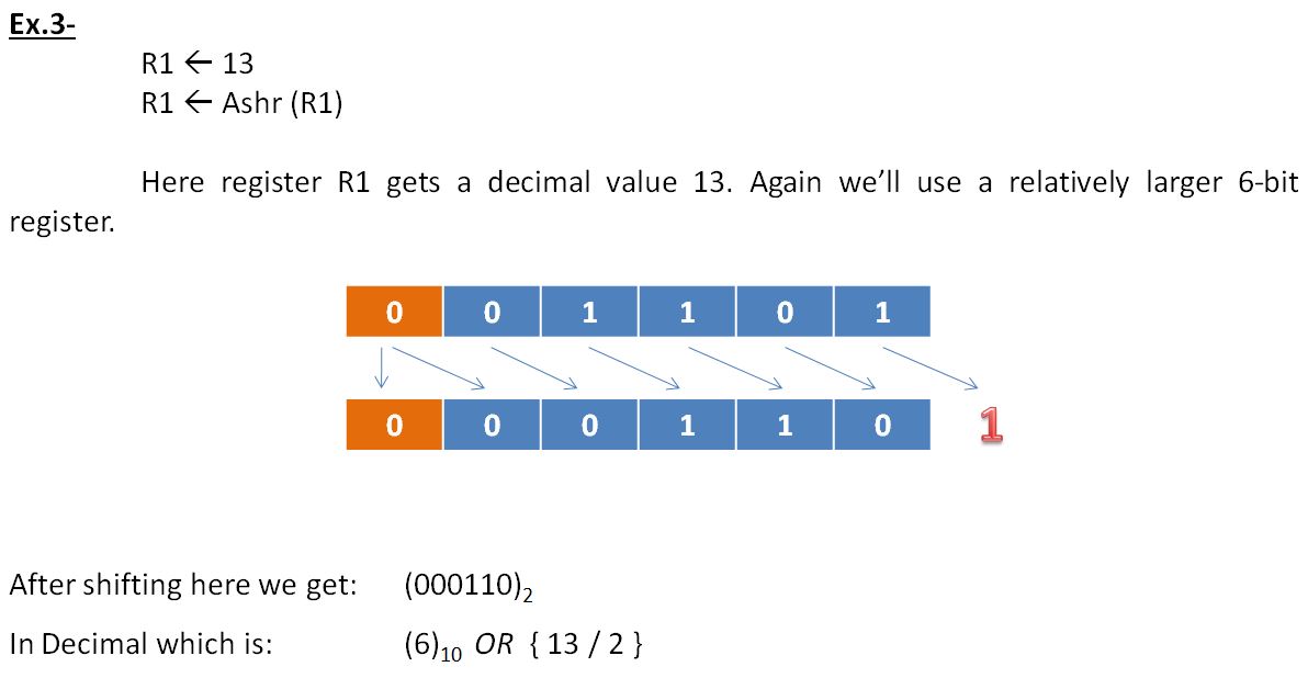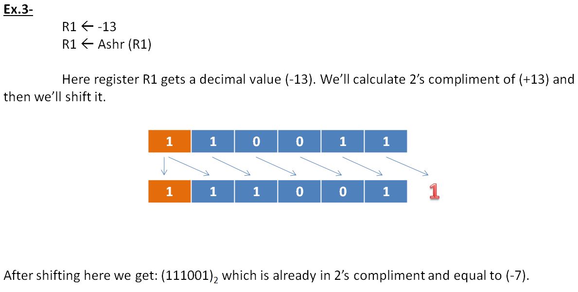 Arithmetic Right Shift: Every bit gets shifted towards right. The right most bit (LSB) gets lost and the sign bit is copied to the MSB-1 position. Again in this case, the sign bit remains the same.