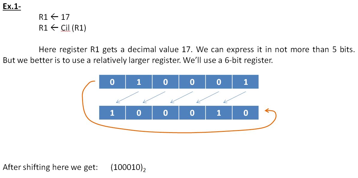 Circular Left Shift: Every bit gets shifted towards left. The left most bit (MSB) extracts and gets appended to the LSB position.