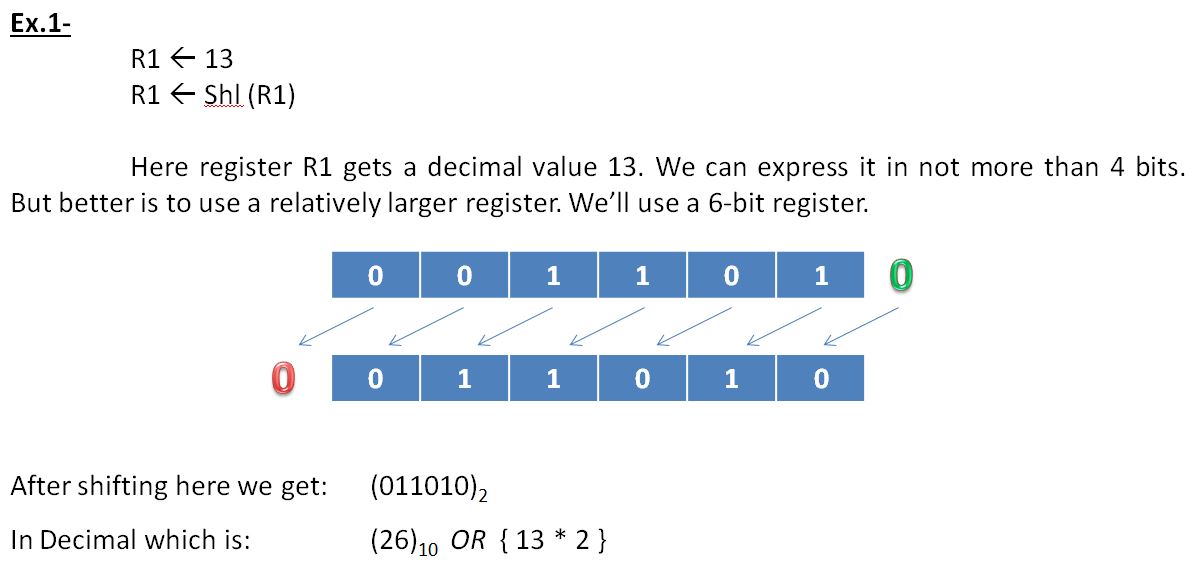 Logical Left Shift: Every bit gets shifted towards left. The left most bit (MSB) gets discarded and a zero fills the vacated LSB position. Mathematically this operation shows that the number is multiplied by 2.