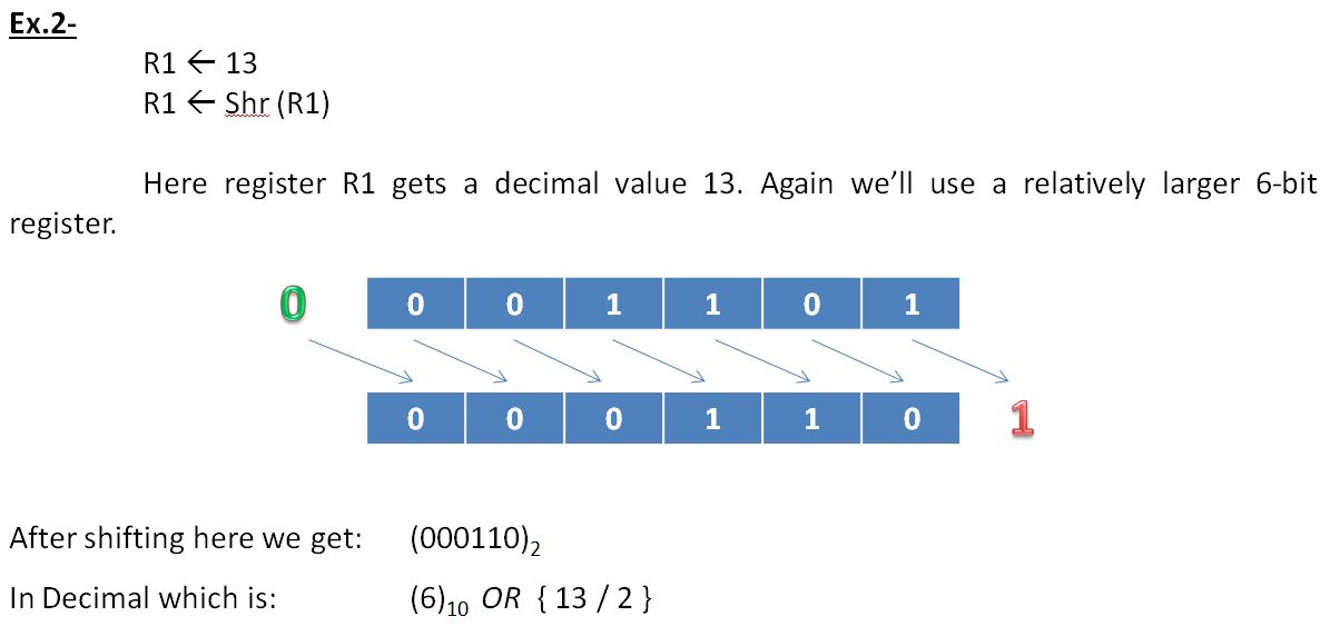 Logical Right Shift: Every bit gets shifted towards right. The right most bit (LSB) gets discarded and a zero fills the vacated MSB position. Mathematically this operation shows that the number is divided by 2.