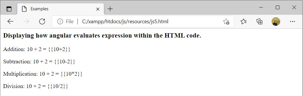 For example, an expression {{6/2}} will produce the result 3 and will be bound to HTML.