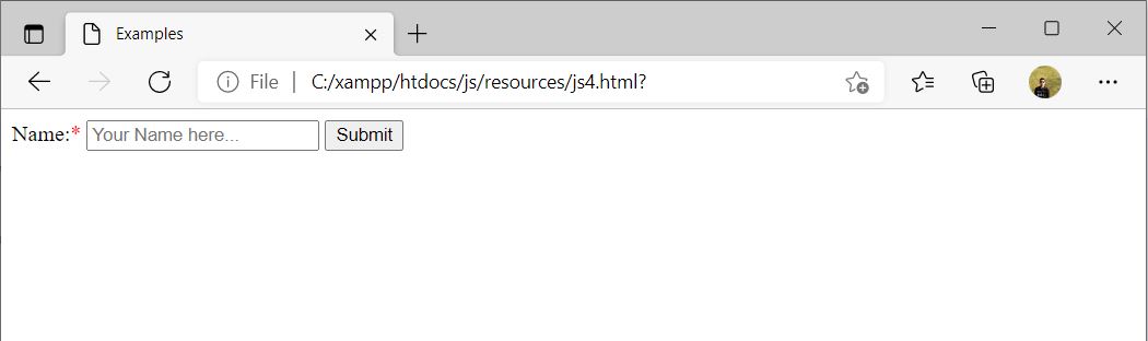 Here, we are taking a simple form with only one Name field and enforcing user to fill the name and if name data is not filled and submit button is clicked it will display an alert to the user.