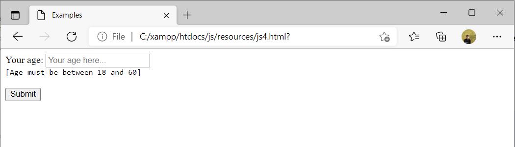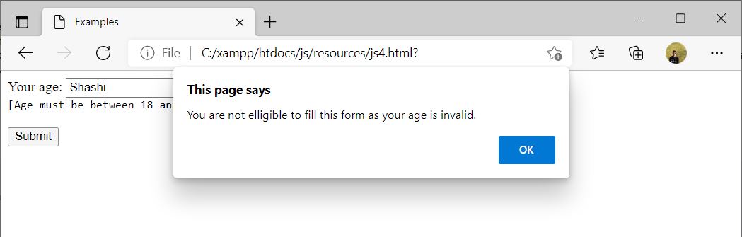In the example below, we have created a JavaScript Function myAge() to check the valid age entry. The function myAge() is called onclick event of Submit button. It will display the message as well as Alert about the Valid or Invalid age entry.