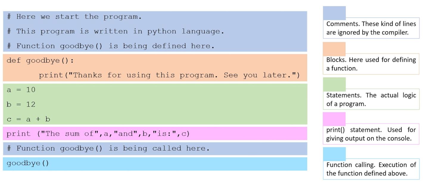 Following is a sample program in python that shows how comments, statements, function definitions and function calling are done.